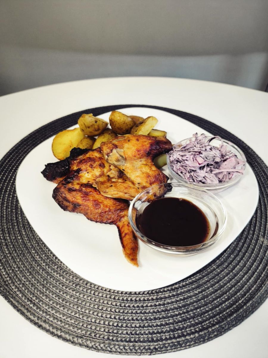 Grilované kuracie krídielka, domáce pečené zemiaky, BBQ dresing, coleslaw šalát