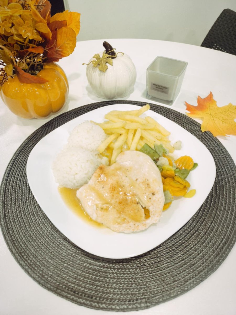 Kurací steak na prírodno 150g, ryža, hranolky, anglická zelenina