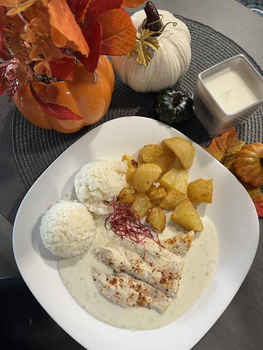 Kurací steak na nivovej omáčke 150g, ryža, domáce pečené zemiaky