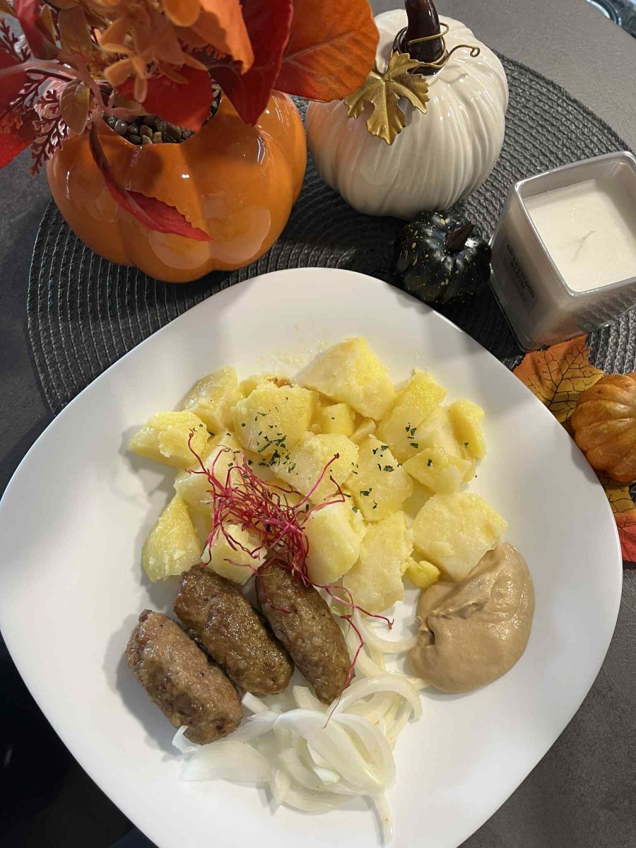 Bravčové čevapčiči 150g, varené zemiaky, cibuľa, horčica