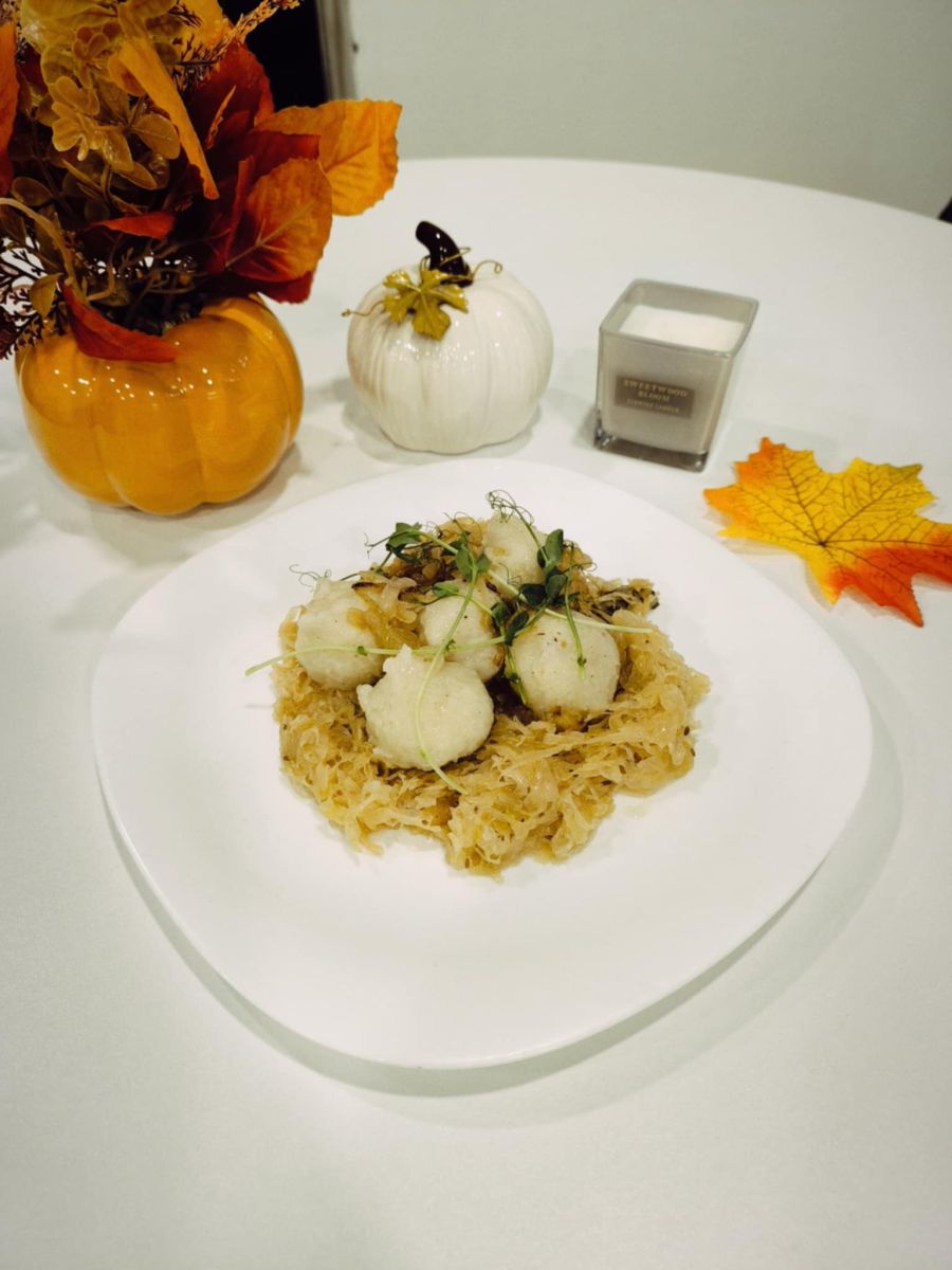 Zemiakové knedlíčky plnené údeným mäsom na kyslej kapuste