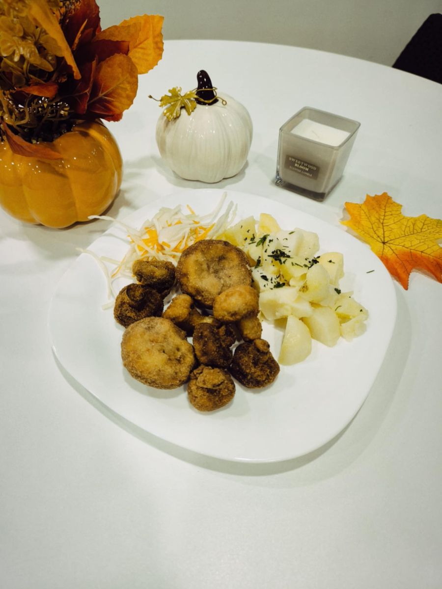 Vyprážané šampiňóny 150g, varené zemiaky, šalát