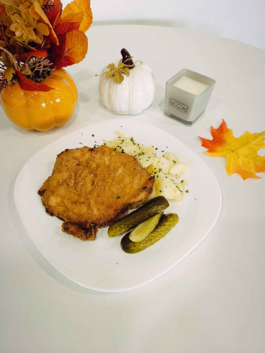 Vyprážaný kurací rezeň 120g, varené zemiaky, kyslá uhorka