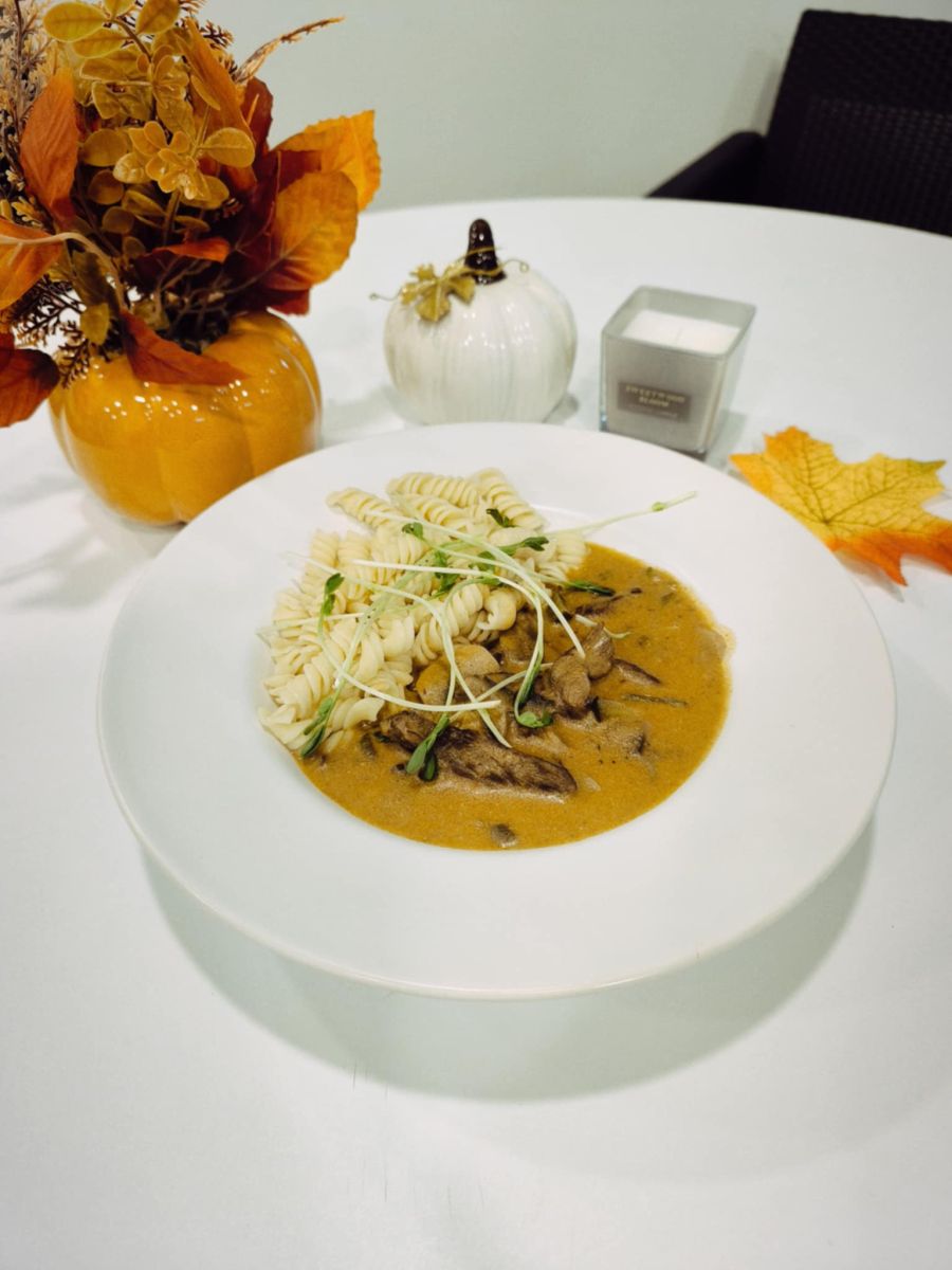 Hovädzí stroganov 150g,fusilli