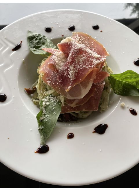 Ryžové rezance s bazalkovým pestom, susšnými paradajkami a prosciuttom